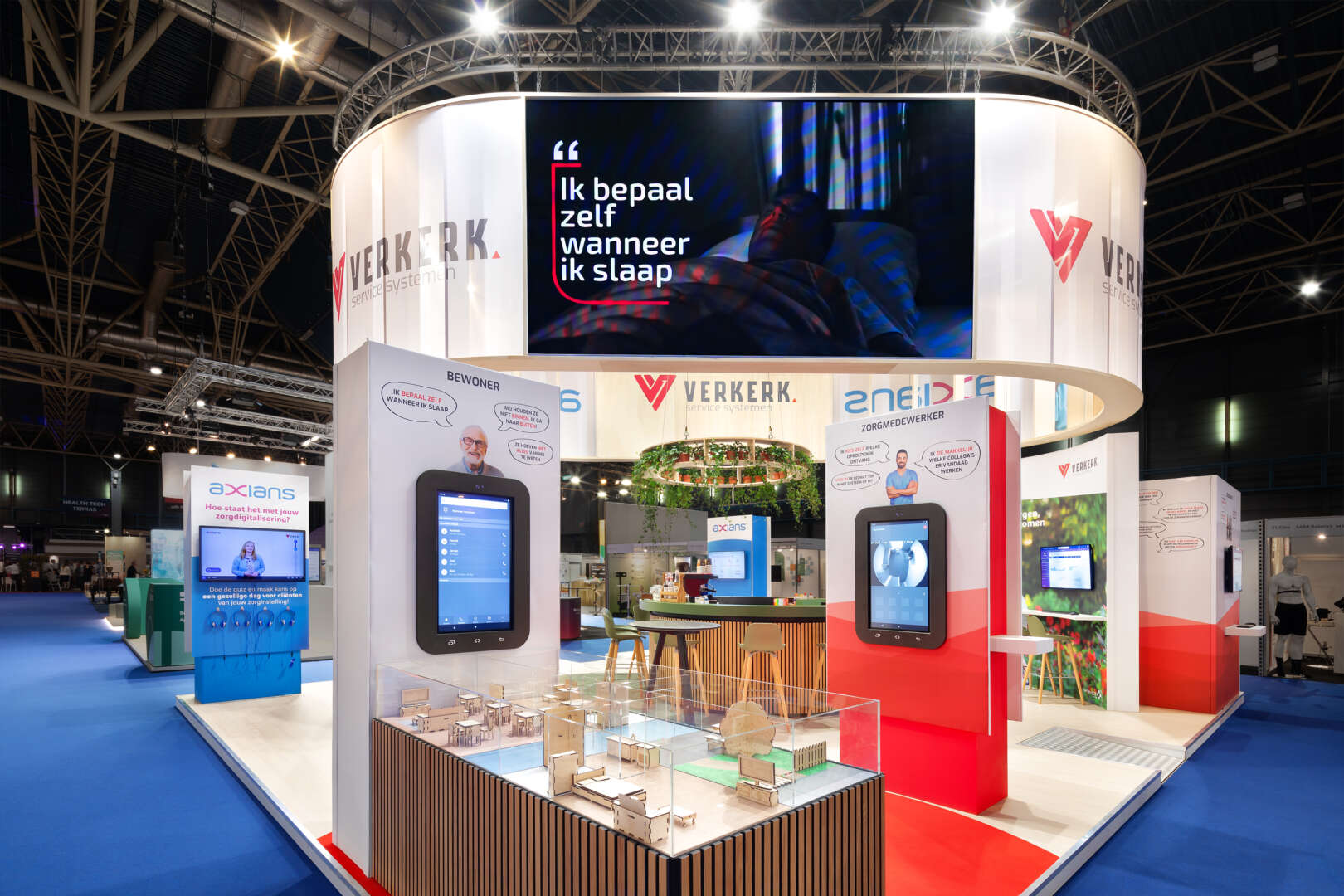 Axians NL & Verkerk Service Systemen approached us with a request to create a striking trade show booth for the annual Zorg & ICT trade show. These two organizations, each with their own unique identity, share booth space at the trade show.