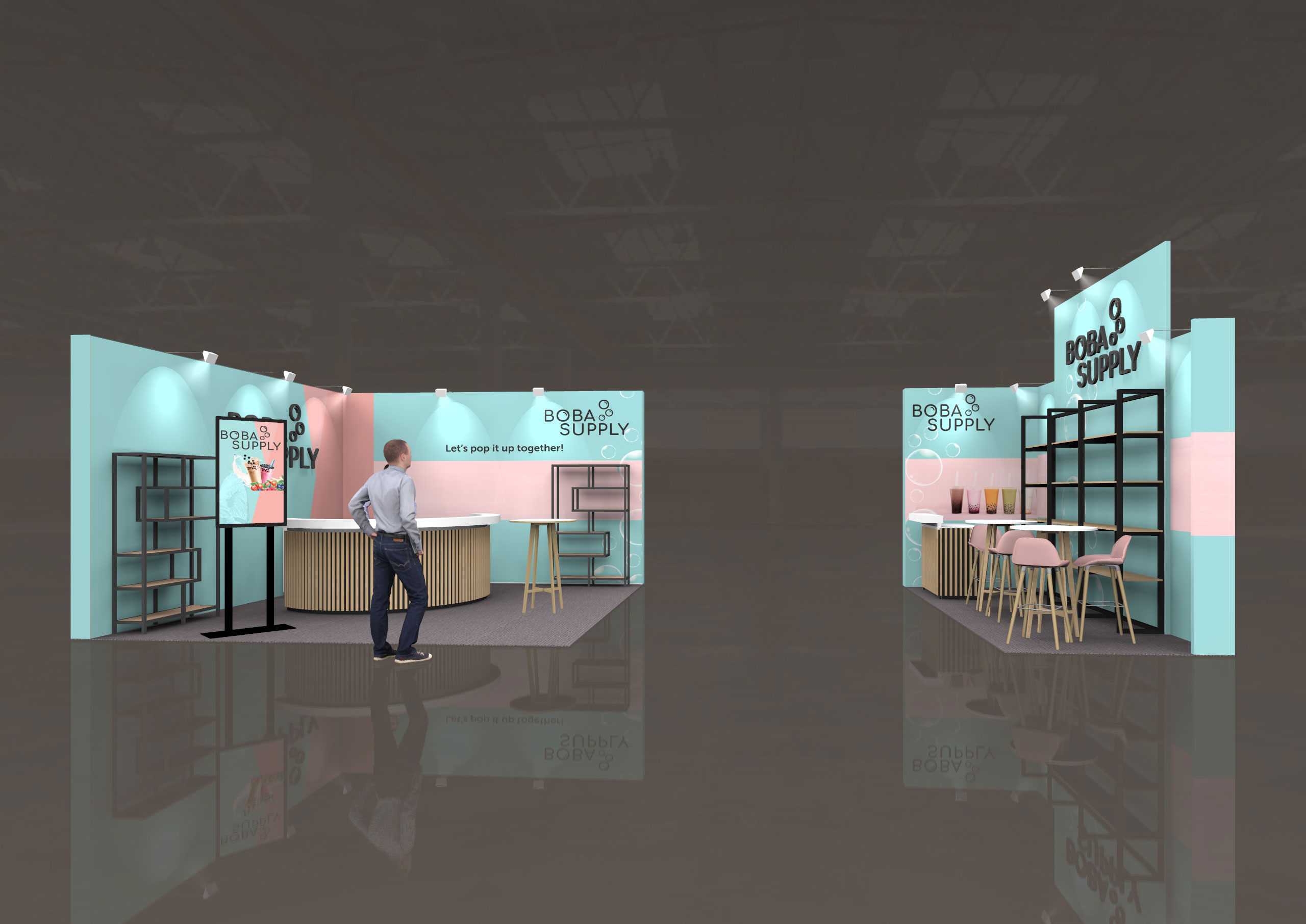 The design reflected Boba Supply’s brand identity with pastel colors, playful bubble motifs, and a light, welcoming look. The dual-stand concept boosted visibility and gave each space a clear role: one for live bubble tea preparation, the other for tasting and interaction. Built with lightweight modular materials, the stands combined warm wooden details, digital screens, and open shelving for a dynamic presentation. Despite functioning separately, the consistent design ensured one unified brand experience.