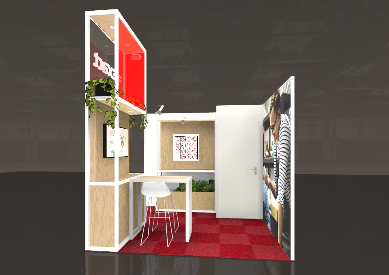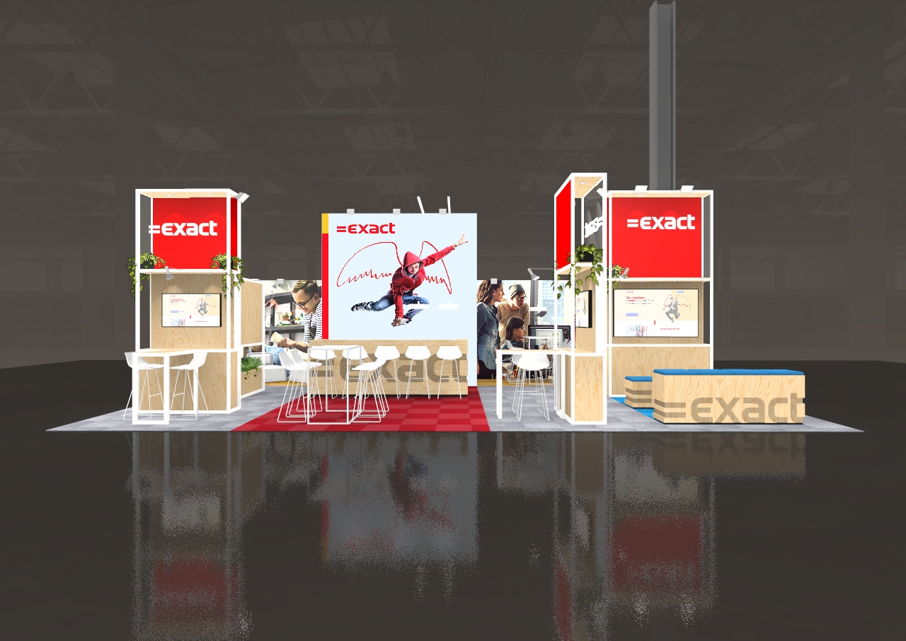 - De stand is ontworpen met ruimte voor demonstraties van de softwareproducten van Exact, goed zichtbaar voor bezoekers.