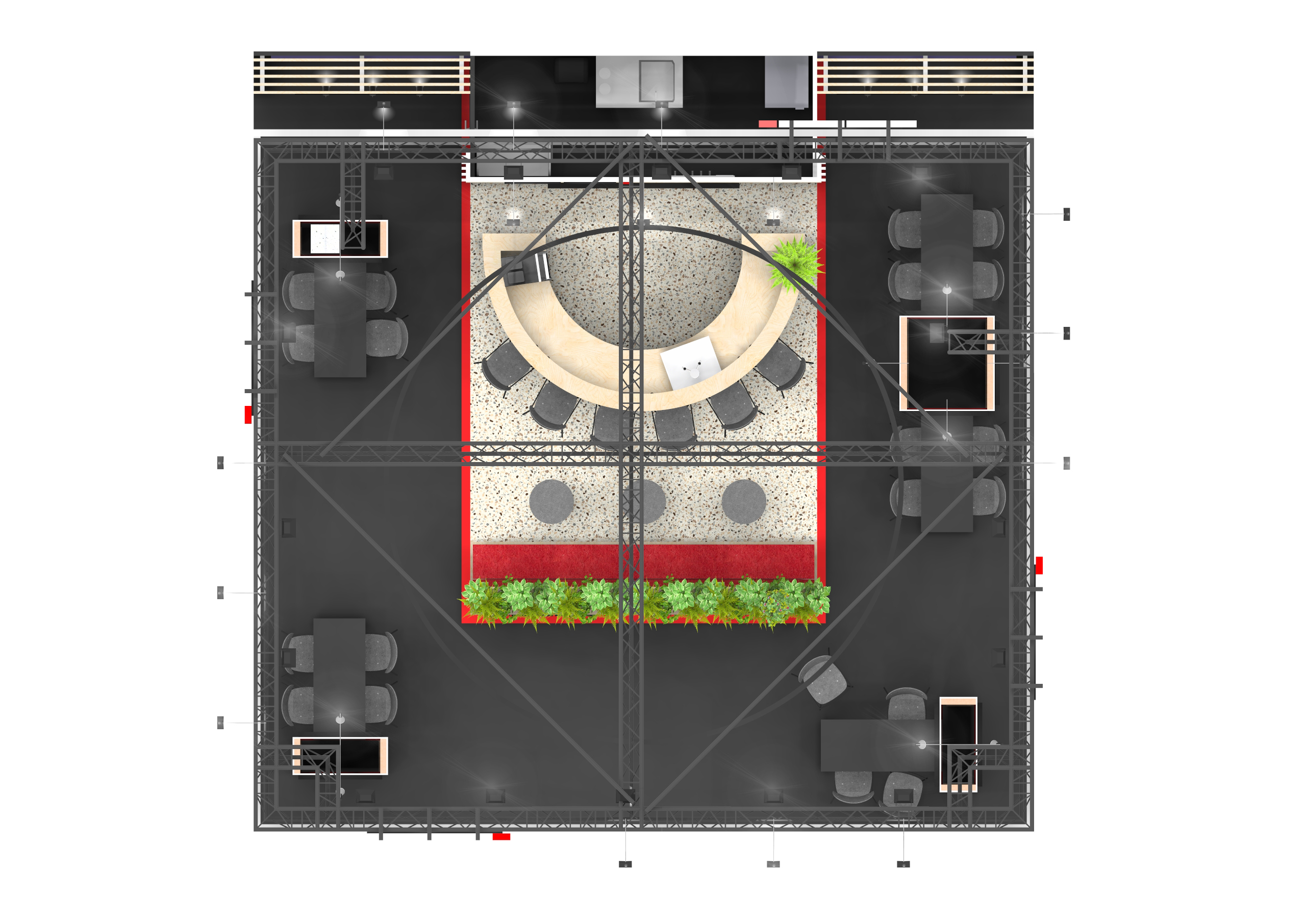 Om een strakke uitstraling te behouden, is gekozen voor een verhoogde vloer waarmee alle bekabeling onzichtbaar werd weggewerkt. De vloer werd verdeeld in zones, waardoor de overgang tussen hospitality en demo subtiel maar duidelijk was.