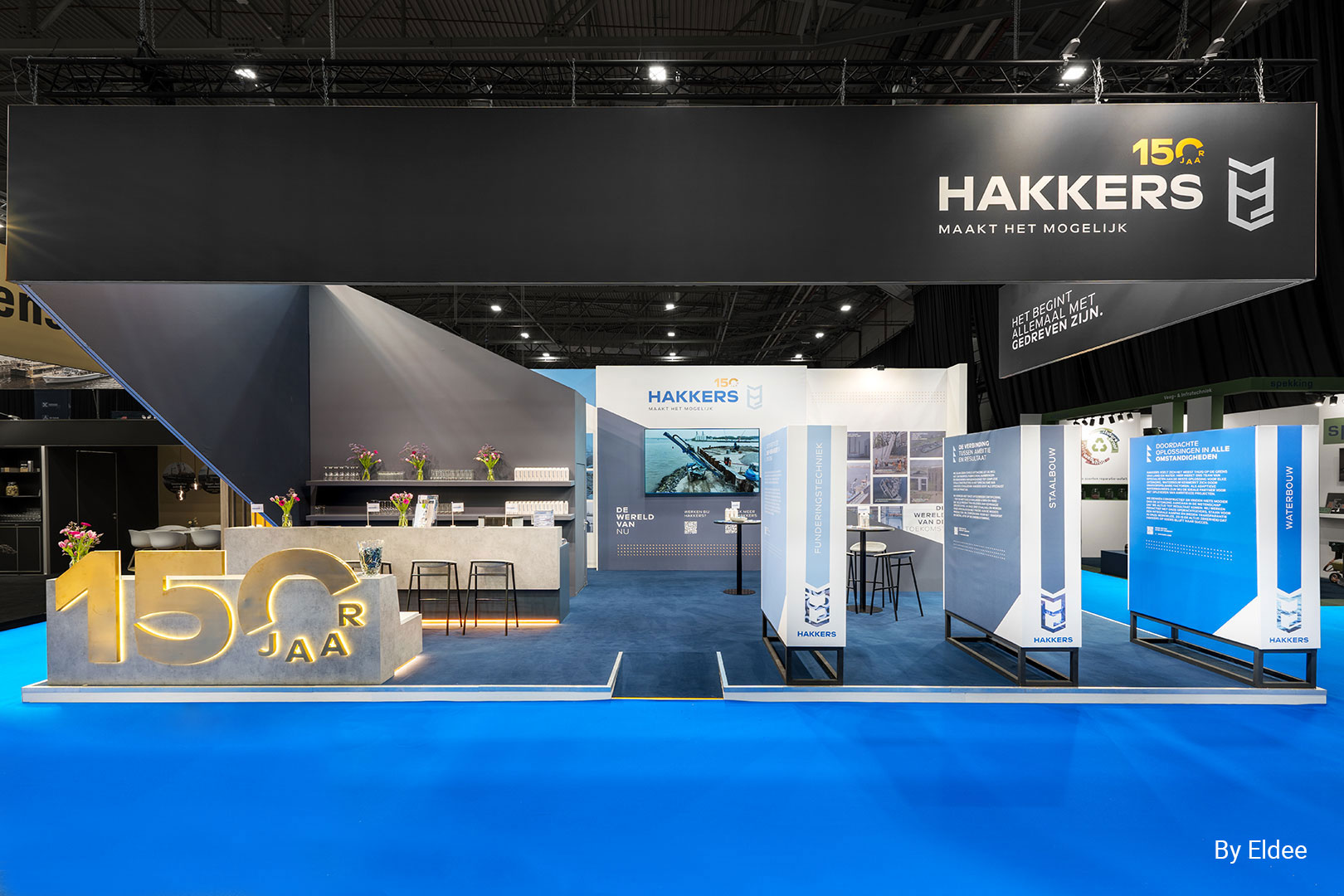 Met deze stand zette Hakkers een statement neer: 150 jaar innovatie en nog lang niet klaar met de toekomst. Een krachtige combinatie van historie, expertise en een vooruitstrevende blik, vertaald naar een opvallend en doordacht beursontwerp.
