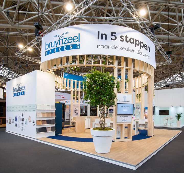 Voor optimale zichtbaarheid op de beursvloer is gekozen voor een grote ovale hangende banner met rondom branding. Deze zorgde voor sterke herkenbaarheid en trok al van veraf de aandacht van bezoekers.