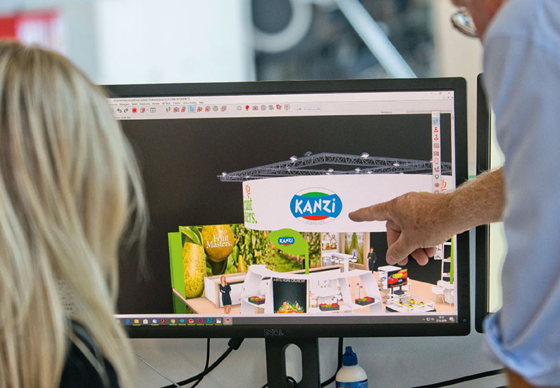 Om die operaties elke keer weer soepel te laten verlopen hebben de mensen van FruitMasters behoefte aan een betrouwbare partner. Dick Heijmans: “Een bedrijf dat ons niet alleen steeds opnieuw moet verrassen met een opvallend en aantrekkelijk standontwerp, maar dat ook alle zaken om zo’n beursdeelname voor ons kan regelen. Vergis je niet, een beursdeelname is meer dan een stand opbouwen. Je praat over vergunningen, veiligheidseisen, logistiek en transport, over de ruimte voor catering de bouw van een of meerdere spreekkamers, het aantal verversingskoelkasten voor fruit, nemen we alle apparatuur mee of huren we het ter plekke. Dat moet allemaal binnen een beperkte tijd en een afgesproken budget worden beslist en gerealiseerd.” Caroline Drost: “Dat is precies wat we doen. We faciliteren onze klanten van A tot en met Z. Natuurlijk hoeven we bij een bedrijf als FruitMasters niet uit te leggen wie ze zijn, het is een wereldspeler. In elke briefing bespreken we uitvoerig wat hun doel is, waar deze keer de nadruk op zal liggen. Wij houden ons dan bezig met het ontwerp, daar hebben we met ons 6 stappenplan een bijzondere werkwijze voor ontwikkeld. Daarin worden ook factoren als duurzaamheid, veiligheid, opslagvolume en transport en logistiek meegenomen. Voor klanten met een beurs in de USA bouwen we de stand bijvoorbeeld helemaal zelf, in Rusland kun je dat uitbesteden en doen we alleen de eindcontrole. FruitMasters blijft natuurlijk tijdens het gehele proces als opdrachtgever de kritische sparringpartner met het verstand van fruit. Daar bemoeien we ons helemaal niet mee.”
